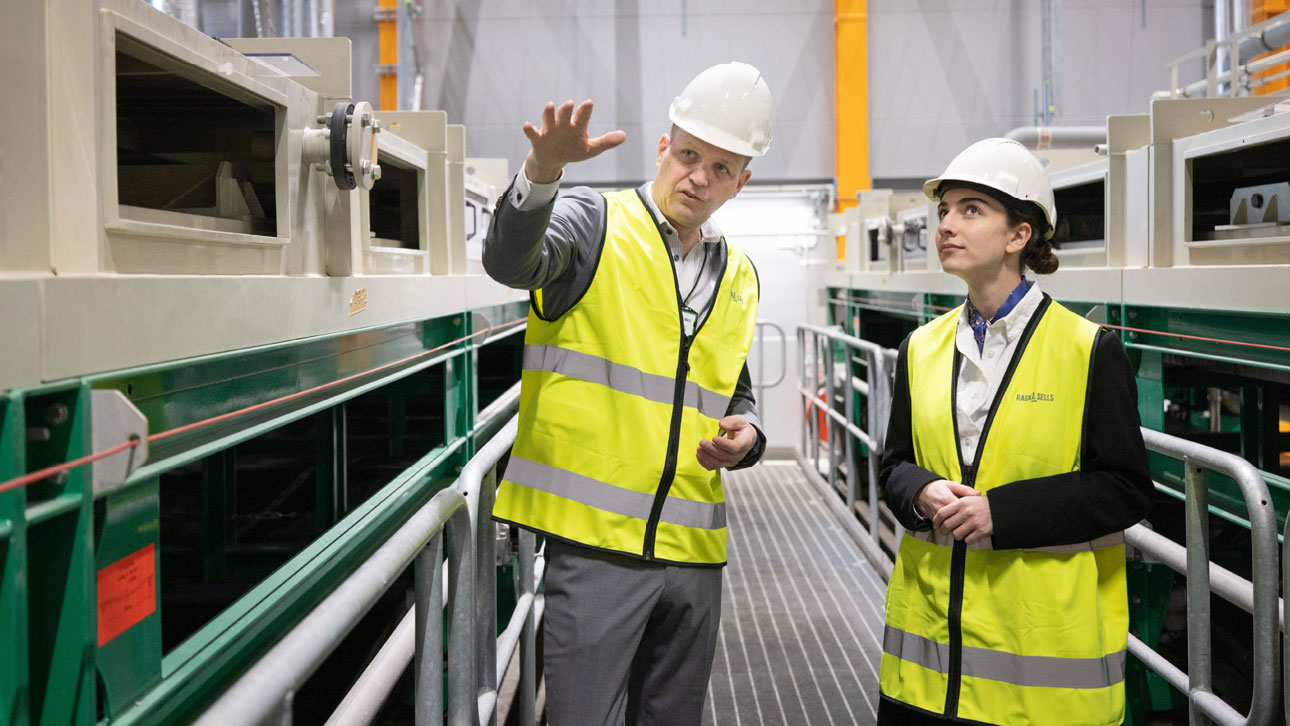 Romina Pourmokhtari og Mikael Hedström, administrerende direktør i Ragn-Sells Treatment & Detox, under en guidet omvisning på fabrikken. Foto: Ragn-Sells