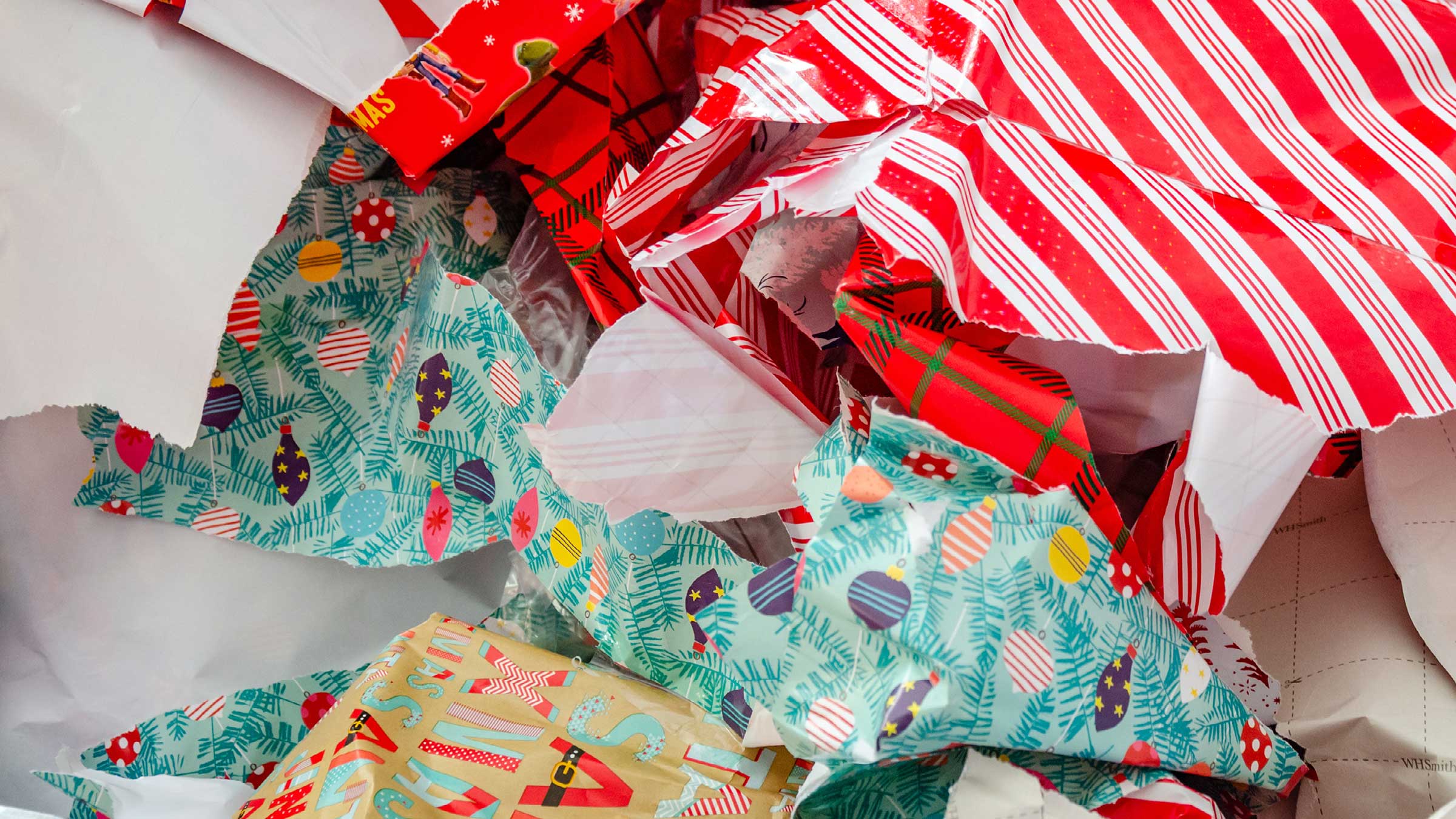 Glanset gavepapir og gavebånd skal sorteres som restavfall. Prøv å unngå glanset gavepapir, for det kan ikke gjenvinnes og må av den grunn sorteres som restavfall. Har du store mengder kan du samle opp i transparente avfallssekker som kan leveres på den lokale gjenvinningsstasjonen, mange gjenvinningsstasjoner tar imot gavepapir gratis etter jul.