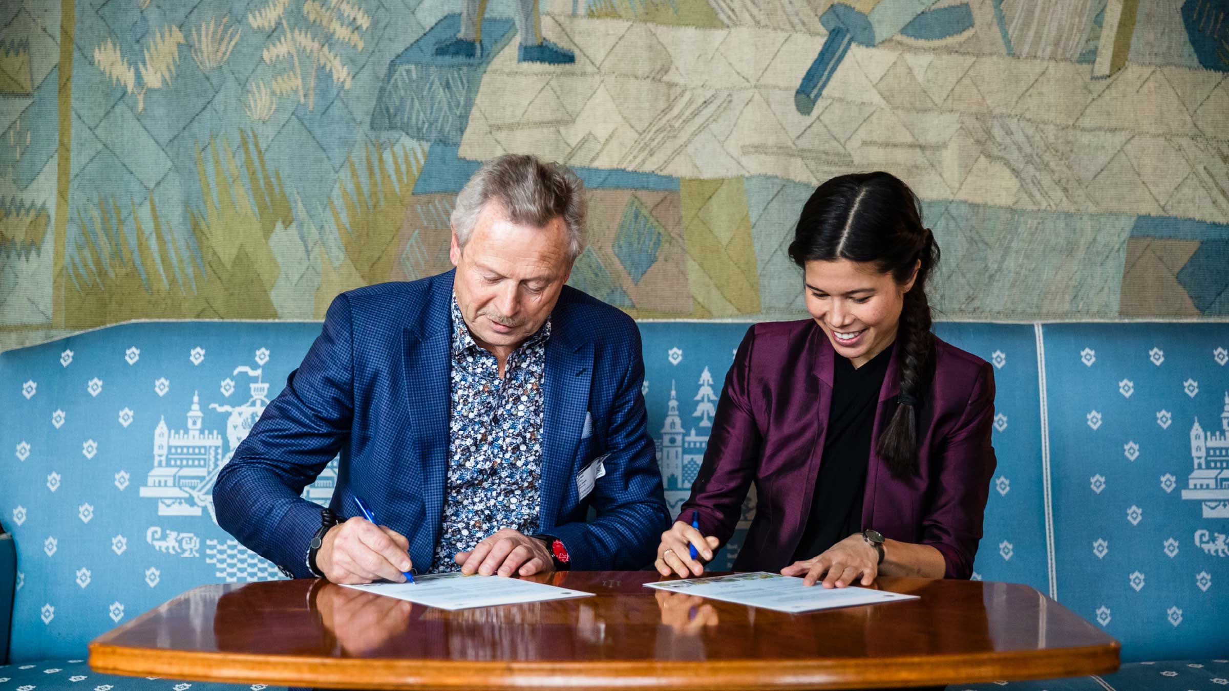 Bjørn Hoel, administrerende direktør i Ragn-Sells AS og Lan Marie Nguyen Berg, byråden for miljø og samferdsel, under signering av avtalen.