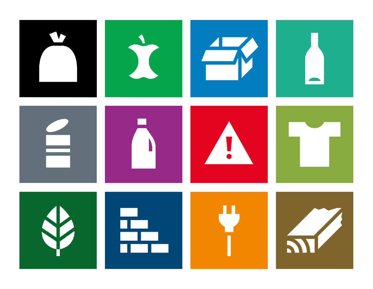 Den nye ordningen er universelt utformet og følger en rød tråd med symboler og farger. Illustrasjon: Ragn-Sells