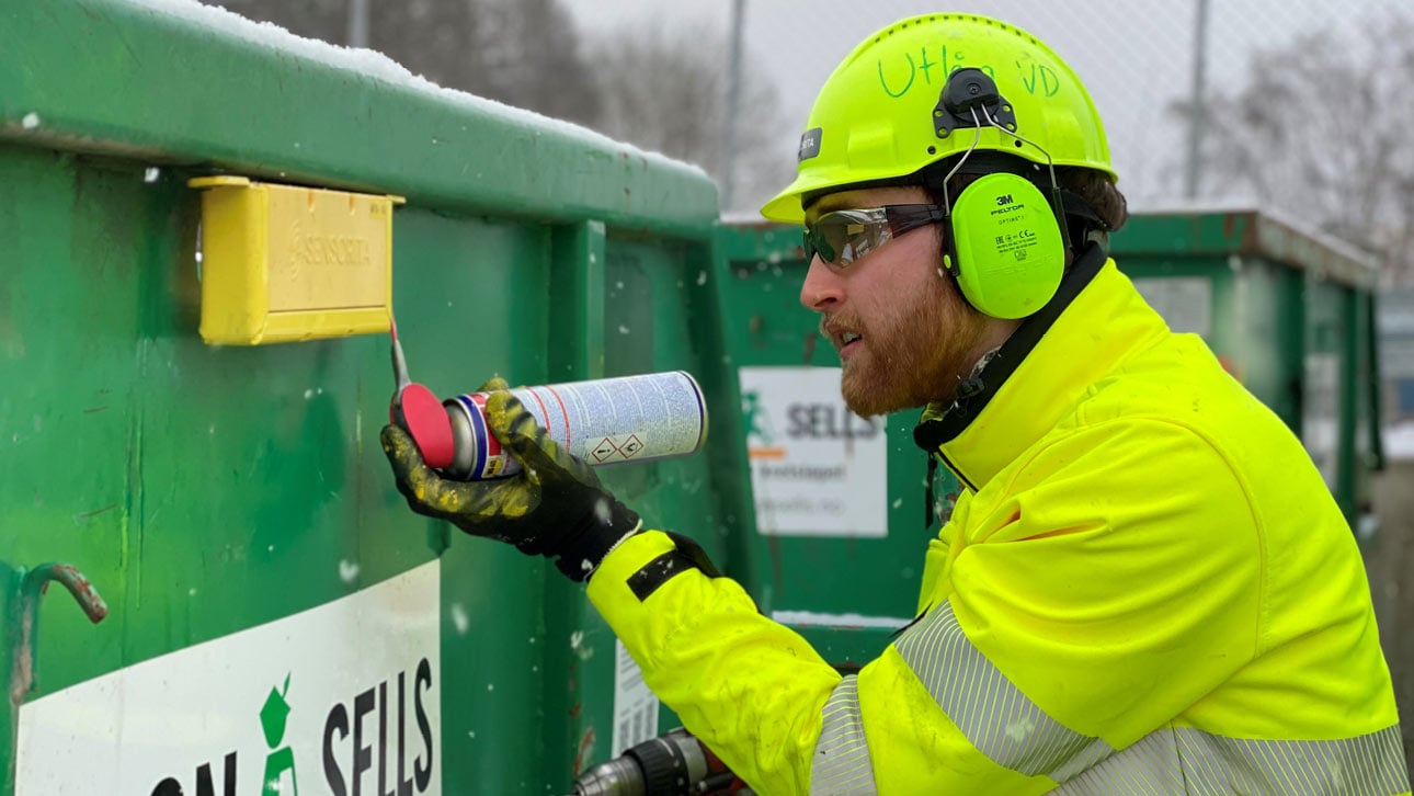Severin Schirmer fra Sensorita monterer en sensor på 10m3 container. Foto: Sensorita